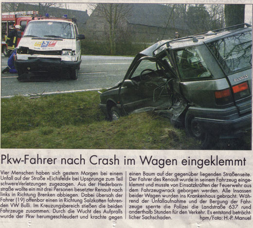 Großer Schreck für das 24h-Team: Rambo (oder auch Röhrich) zerlegt auf dem Weg zur Arbeit seinen Firmenbulli, der dem Team als "Einsatzfahrzeug" dient. Ihm wurde von so einem Schnösel die Vorfahrt genommen. Zum Glück gab es keine größeren Verletzungen und auch Folgeschäden sind (neben den schon bestehenden) nicht zu erwarten.